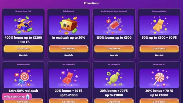 Το πλάνο καλωσορίσματός μας ξεκινά με προσφορά εγγραφής τύπου LollySpins casino μπόνους χωρίς κατάθεση: €0 + 10 δωρεάν περιστροφές, με απαίτηση τζίρου 50x. Έπειτα, μπορείτε να επιλέξετε να κάνετε κατάθεση και να ξεκλειδώσετε σταδιακά τα μπόνους αντιστοίχισης. Η προσφορά 1ης κατάθεσης δίνει 100% έως €500 + 100 δωρεάν περιστροφές, με ελάχιστη κατάθεση €25.