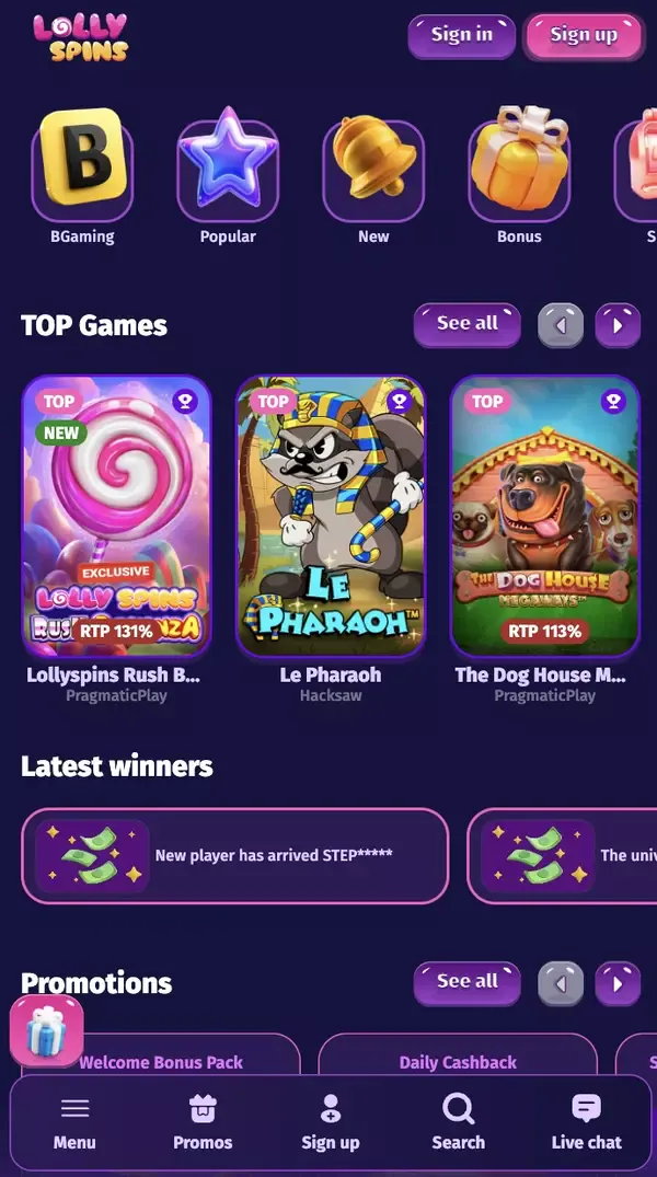 Για ποικιλία παιχνιδιών, φιλοξενούμε 11.000 τίτλους σε πολλαπλά στυλ. Θα βρεις κουλοχέρηδες LollySpins σε κλασικές, video και γεμάτες λειτουργίες μορφές, καθώς και Live Casino με πραγματικούς dealers, Επιτραπέζια Παιχνίδια, Παιχνίδια Τζακπότ, Crash Games, Bingo, Keno και Ξυστά. Αν συγκρίνεις την εμπειρία καζίνο LollySpins με το παιχνίδι σε desktop, η βασική διαφορά είναι μόνο το μέγεθος οθόνης, όχι το περιεχόμενο.